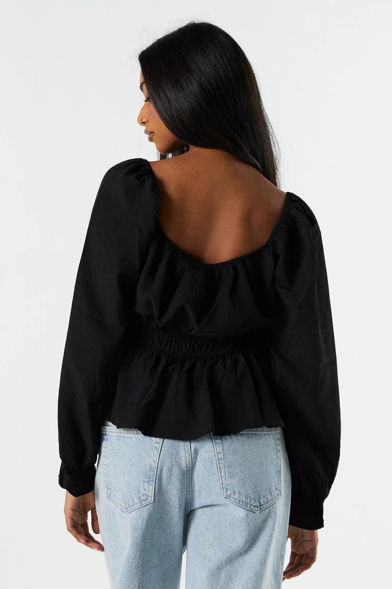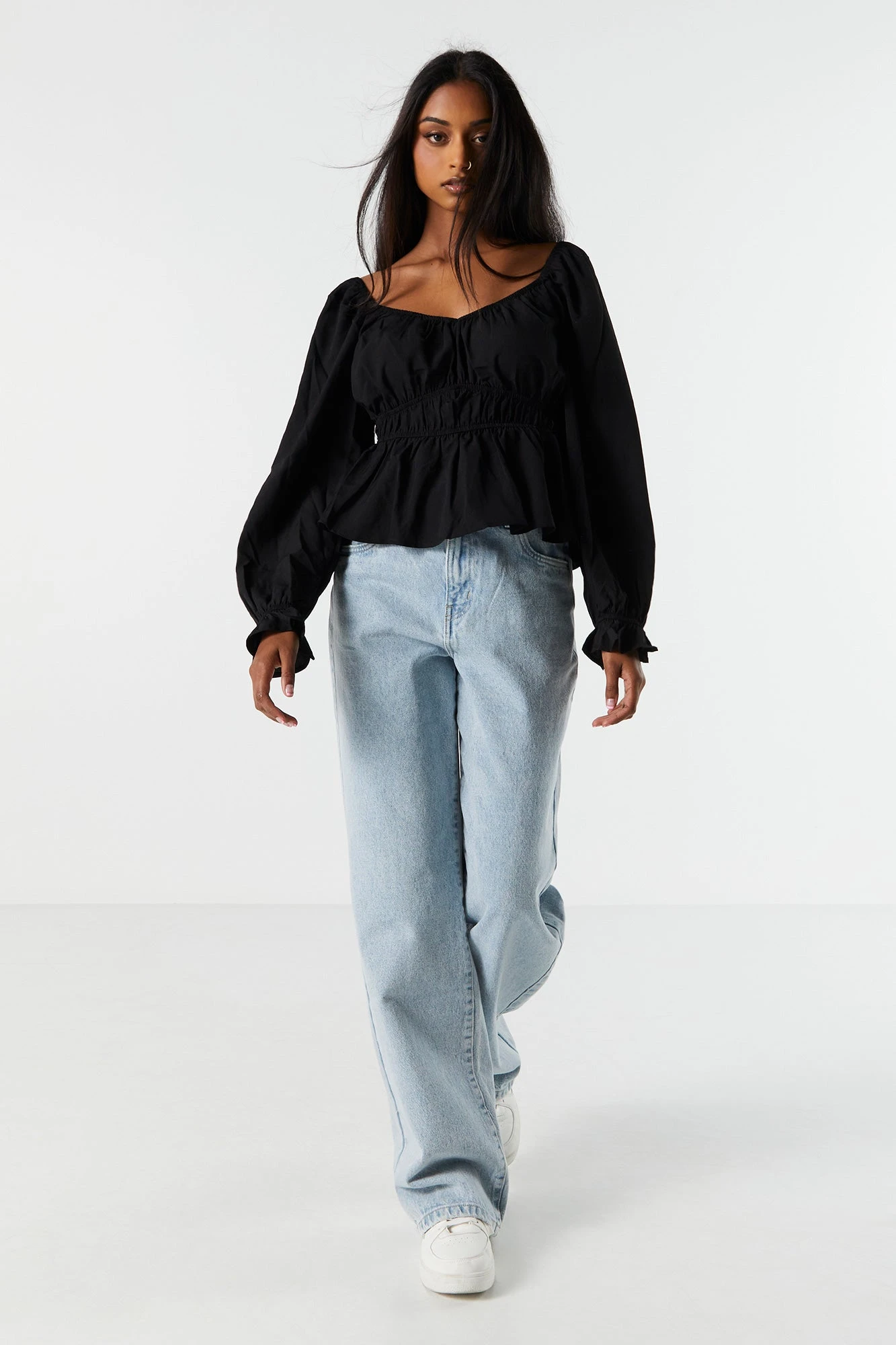Own the spotlight in this versatile long sleeve. This top features elastic waist, long sleeves, V-neckline, and cinched wrists.