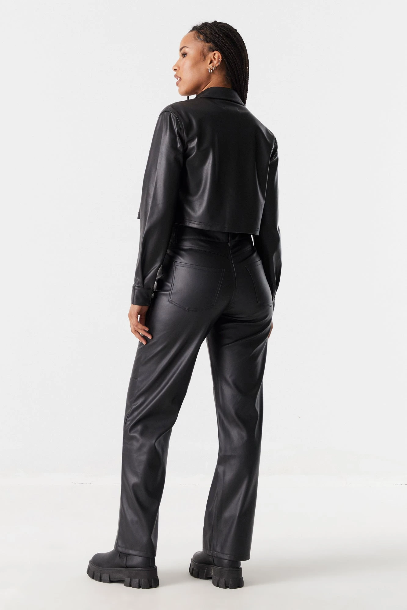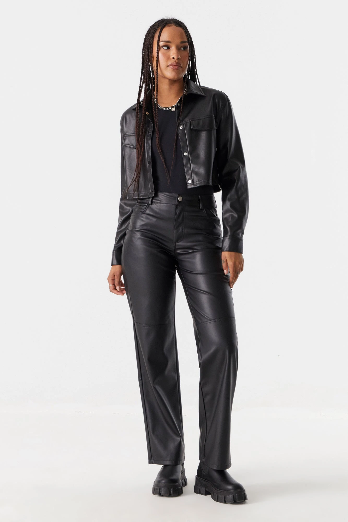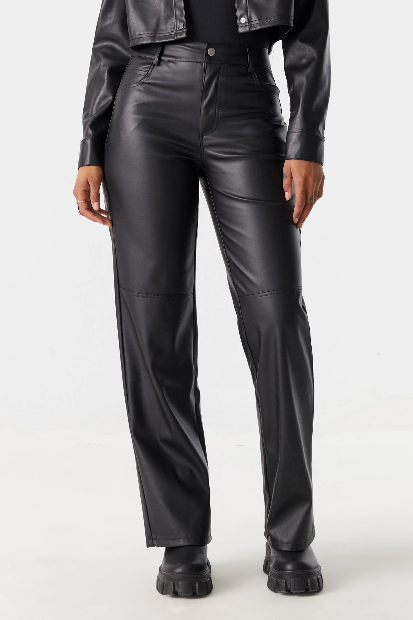 Your fashion bottoms game just got a whole lot fiercer! Faux-leather is the must have material of the season. This pant features belt loops, zip-fly button-up closure, wide leg, faux leather material, wide leg and four pockets. Size runs small.