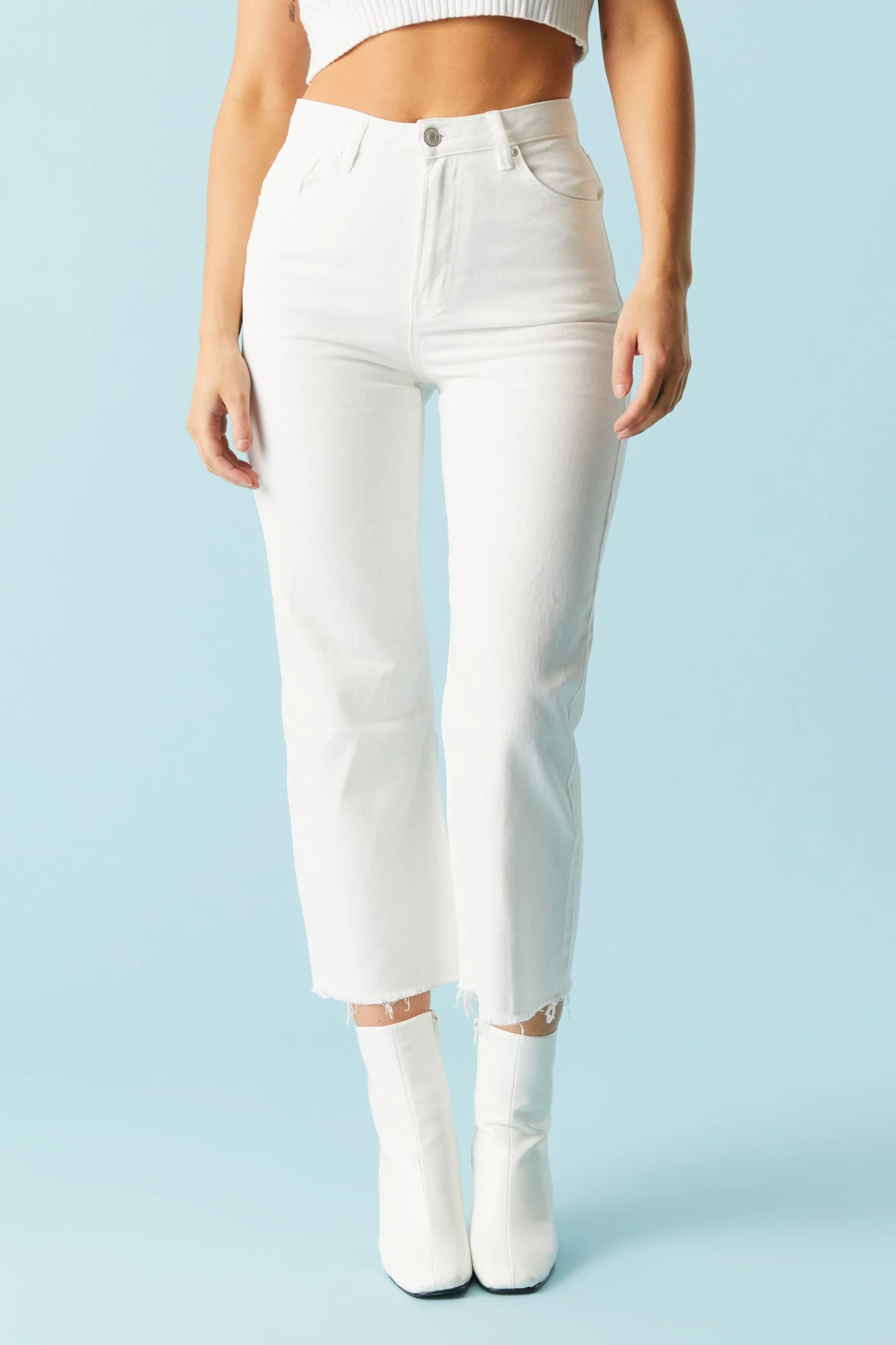 Strike a pose and steal some hearts in these fierce wide leg bottoms. This jean features wide leg, five pockets, zip-fly button-up closure, medium wash and raw ankle hem.