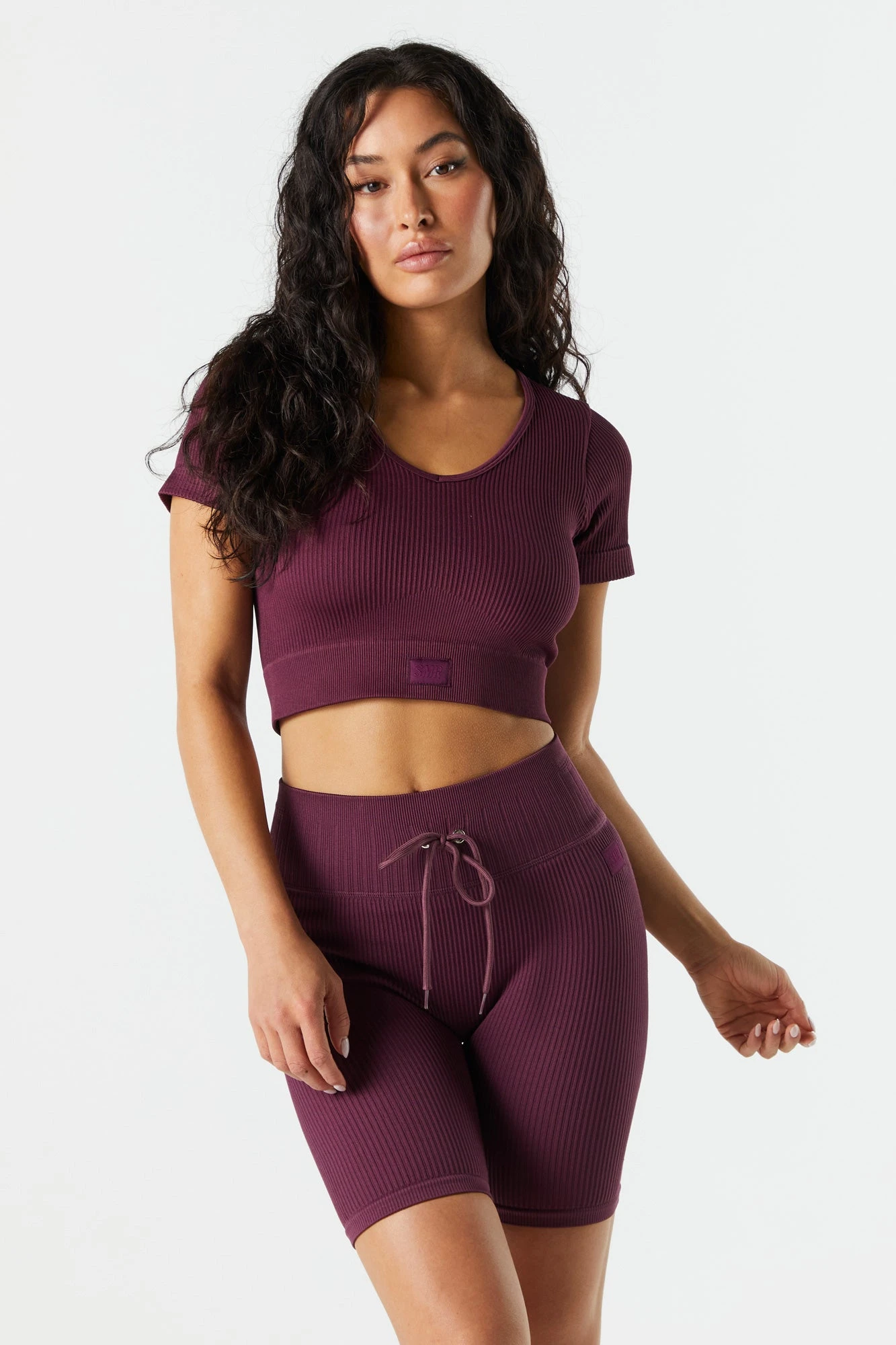 Suitable for gym sessions, yoga, and other active pursuits. A trendy and functional addition to your activewear collection. Sommer Ray seamless ribbed active short sleeve tee is made for a comfortable and stylish workout. Features a seamless constructions, cropped length, rubber patch logo and crew neckline. Short sleeves help keep you dry during exercise. Match with Sommer Ray Seamless Ribbed Active Tie Legging. Size runs small.